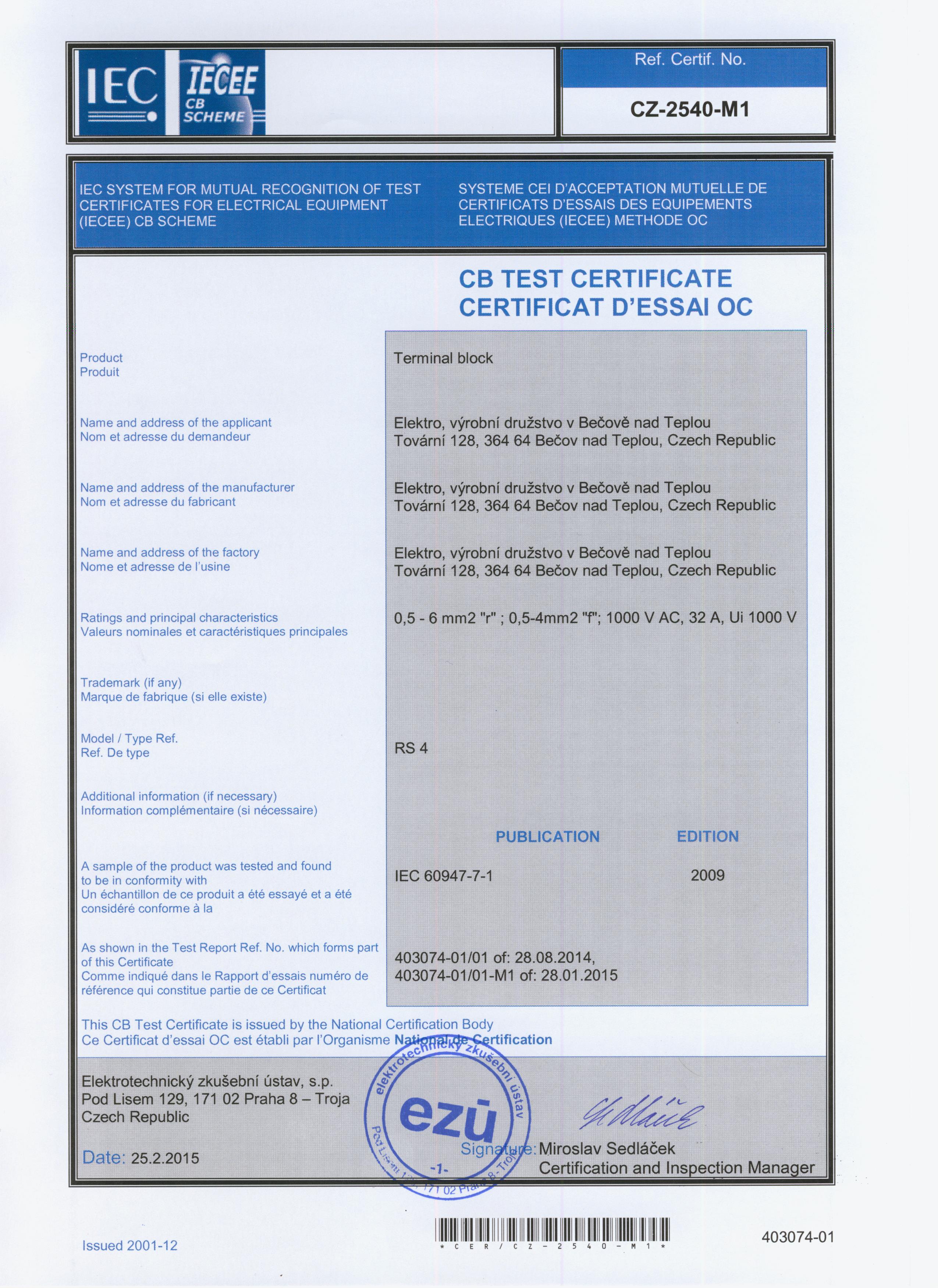 Home page /Downloads /EB Certificates, Declaration of Conformity /Terminal blocks RSA - Certificates / Terminal blocks RSA - Certificates For download .jpg CB_RSA_2,5A 1.09 MB .jpg CB_RSA_4A 1.05 MB .jpg CB_RS4 1.28 MB .jpg CB_RSA_6(10)A 1.09 MB .jpg CB_RSA_16A 1.14 MB .pdf CB_RSA_35A_2025 1.53 MB .jpg CB_RSA_70A 1.29 MB .jpg KEMA_RSA_2,5A 1.02 MB .jpg KEMA_RSA_(PE)_4A 1.06 MB .jpg KEMA_RS4_RS4PE 1.04 MB .jpg KEMA_RSA_(PE)_6A 1.08 MB .jpg KEMA_RSA_(PE)_10A 1.07 MB .jpg KEMA_RSA_16A 1.05 MB .pdf IECEx_Certificate_of_Conformity__ 2.26 MB .pdf FTZU_18_ATEX_0103U_-_CZ_ 7.65 MB .pdf FTZU_18_ATEX_0103U_-_EN_ 7.91 MB Kontakty Chcete se stát naším obchodním partnerem a prodávat naše produkty? Ozvěte se nám. Napište nám